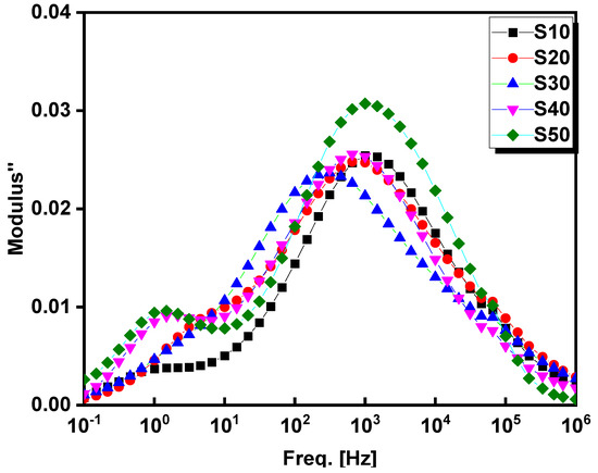 The behavior of the imaginary part of the electric modulus (M″) versus frequency at room temperature is shown in Figure 10. It can be observed that all samples exhibited two relaxation peaks in their imaginary part of the electric modulus (M″). One peak is observed at a low frequency, while the other is located in the high-frequency region. The position of these peaks varies due to differences in microstructure among the samples. Two distinct sections can be seen in the plot of the imaginary component of the electric modulus (M′). The first part corresponds to the low frequency range, where ions can travel over long distances, or effectively jump from one site to adjacent site. The second part corresponds to the high frequency range, where ions are confined to their potential wells. It is worth noting that sample S30 has a single relaxation peak at a low frequency. The symmetric broadening of the imaginary part peaks suggests that the conduction mechanism is related to Debye type.