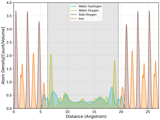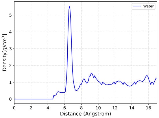 The density profile of liquid water at the water–hematite interface is illustrated in Figure 4. Unlike other studied liquid water–solid interfaces [62], the water–hematite interface exhibited only a single prominent peak in the density profile. This single-peak density profile is consistent with experimental X-ray reflectivity (XR) results, which indicated a single layer of water molecules forming the adsorption layer [63]. This phenomenon is attributed to the strong screening of the hematite surface dipole by the adsorbed water layer. The density of bulk water was achieved within approximately 5 Å from the slab, confirming the presence of bulk-like structures in the middle of the water slab. Furthermore, the water density profile provides insight into the nature of interactions at the interface. Confined interactions, characterized by a narrow peak width, were not observed in this simulation, indicating broader interaction dynamics.