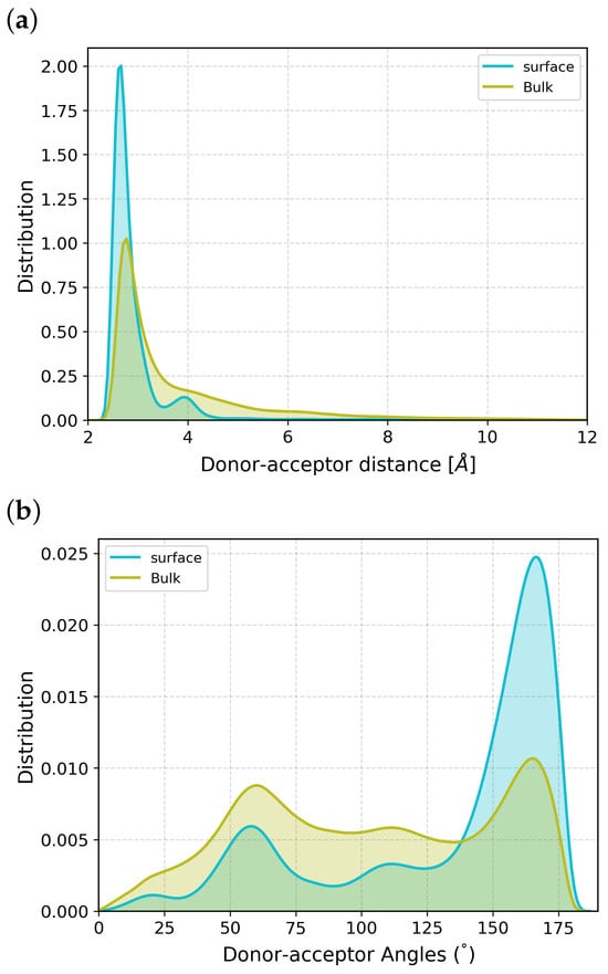 MDTraj [64] was used to calculate the hydrogen bonding based on the Baker-Hubbard method, which identifies hydrogen bonds using cutoffs at a distance (2.5 Å) and angle (120°) between the hydrogen bond acceptors (N and O) and the hydrogen bond donor. The distribution of distances between the donor and acceptor atoms in hydrogen bonds over the entire trajectory is plotted for both the bulk water and surface water molecules separately in Figure 5.
