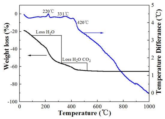 To choose the best thermal decomposition temperature for the samples, the TG-DTA curves of the Na5Zn2Gd(MoO4)6: Eu3+ precursor were studied, as shown in Figure 1. The TG curve shows two distinct weight loss steps up to 500 °C. No further weight loss is observed between 500 and 1000 °C. The weight loss is associated with the decomposition of the organic matrix. The DTA curve consist of three exothermic peaks at 220, 331, 420 °C. The peaks at 220 and 331 °C imply that the thermal occurrences could be related to the depletion of organic species, surface absorbed water, and citric acid. The third exothermic peak at 420 °C is attributed to the crystallization of Na5Zn2Gd (MoO4)6 powder from the amorphous component. However, the particle size distribution of the sample was more uniform at 800 °C than at other thermal decomposition temperatures.