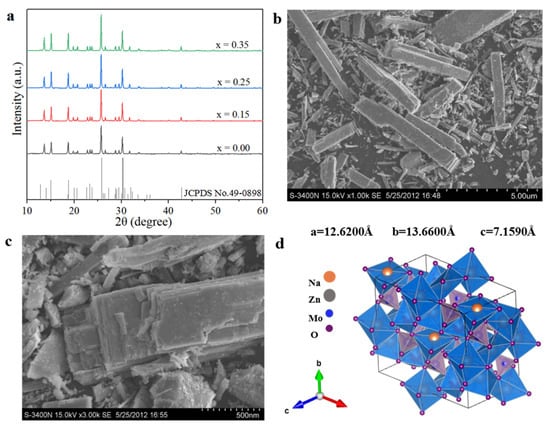 Structure and morphology of Na5Zn2Gd1−x(MoO4)6: xEu3+: (a) XRD patterns; (b,c) SEM images of Na5Zn2Gd0.75(MoO4)6: 0.25Eu3+; (d) crystal structure.