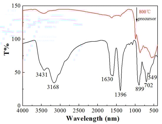 FTIR spectra of the precursor and Na5Zn2Gd0.75(MoO4)6: 0.25Eu3+ phosphor calcined at 800 °C.