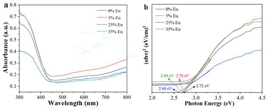 Figure 4a shows the UV diffuse reflectivity spectra of Na5Zn2Gd1−x(MoO4)6: xEu3+. The absorption edges of Na5Zn2Gd1−x(MoO4)6: xEu3+ (x = 0.00, 0.05, 0.25, 0.35) at different concentrations of Eu3+ are 450, 462, 465, and 465 nm, respectively. With the increasing concentration, a red-shift occurs for the absorption edges, which is attributed to the f-f electronic transitions of Eu3+ ions. Meanwhile, Figure 4b shows the Tauc plots obtained from absorption spectra data, and the band gap value was calculated by the Kubelka–Munk equation [22]. The band gaps of Na5Zn2Gd1−x(MoO4)6: xEu3+ (x=0.00, 0.05, 0.25, 0.35) are 2.72 eV, 2.70, 2.69, and 2.68 eV, respectively. The band gap values are close to the same type of doped phosphors such as BMO: Eu3+-500 (Eg = 2.67 eV) [23]. A smaller band gap value is more conducive to absorbing energy to complete the electronic transition process [24].