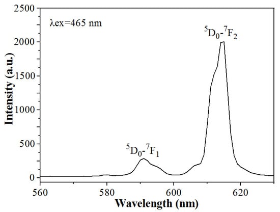 The emission spectrum of Na5Zn2Gd(MoO4)6: Eu3+ phosphor is obtained under the excitation wavelength at 465 nm as shown in Figure 6. The emission band is observed at 614 nm, which is the 5D0→7F2 transition of Eu3+, much higher than at 595 nm (5D0→7F1); the ratio of intensity I5D0-7F2/I5D0-7F1 is about 10. It indicates that Eu3+ occupies a site or sites without an inversion center, and low symmetry. In addition, another emission peak at 580 nm is attributed to the 5D0-7F0 transition of Eu3+ ions. Therefore, Na5Zn2Gd(MoO4)6: Eu3+ phosphor is a phosphor that is excited by blue light and emits strong red light. The 5D0→7F1 transition is mainly magnetic allowed (magnetic dipole transition) in the spectra of Eu3+. At the same time, the 5D0→7F2 is the only center in the absence of inversion symmetry conditions to have low sensitivity to mandatory electric dipole transitions. Thus, Eu3+ was asymmetrically occupied in the Na5Zn2Gd(MoO4)6 lattice sites [26,27,28].
