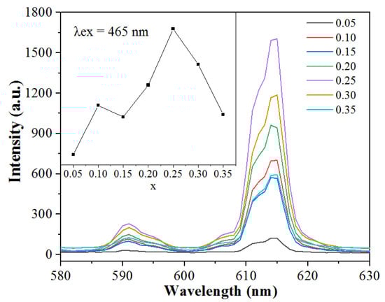 The different intensity of emission spectra under 465 nm excitation corresponding to 5D0→7F2 transition of Na5Zn2Gd1−x(MoO4)6: xEu3+ (x = 0.05, 0.10, 0.15, 0.20, 0.25, 0.30, and 0.35) phosphors after annealing at 800 °C for 2 h are shown in Figure 7. It can be seen that the shapes and positions of all the Na5Zn2Gd1−x(MoO4)6: xEu3+ samples are the same in addition to their relative luminescence intensity. Thus, with the increased concentration of Eu3+ in the host, the luminescent intensity has enhanced and reached a maximum at a concentration of x = 0.25. The rare earth ion itself has a lot of energy levels. As the doping of Eu3+ is further increased, the distance between Eu3+ ions shrinks. The phenomenon of concentration quenching occurs during excitation, resulting in a decrease in luminous intensity. The energy loss at the emission level initiated by the cross-relaxation between excited ions may be the main cause of concentration quenching [29]. The fluorescent emission of Eu3+ is mainly due to the transitions from the metastable level 5D0 to the level 7F2. A significant number of excited ions on the 5D0 level are transferred from the 5D0 to the 7F2 level due to the cross-relaxation process. Consequently, several useful excited ions are consumed through radiation and relaxation processes, and the fluorescence emission is thereby reduced, leading to a decrease in luminous intensity. The optimum molar concentration is 25 mol% in Eu3+ ion-doped Na5Zn2Gd1−x(MoO4)6: xEu3+ phosphor.