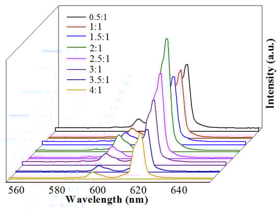 The emission spectra of the Na5Zn2Gd0.75(MoO4)6: 0.25Eu3+ with different ratios of citric acid with metal ions (C: M = 0.5:1, 1:1, 1.5:1, 2:1, 2.5:1, and 3:1) were measured, as shown in Figure 8. The luminescent intensity of samples increased initially and then decreased as the ratio of citric acid to metal ions increased. Thus, it can be observed that the luminous intensity reaches a maximum when the ratio of citric acid to metal ions is 2:1. The pH values with a constant molar ratio of citric acid to metal ions affect the emission intensities of Na5Zn2Gd1−x(MoO4)6: xEu3+. This is because the luminescent performance at different pH values should be attributed to the different morphologies of the products.