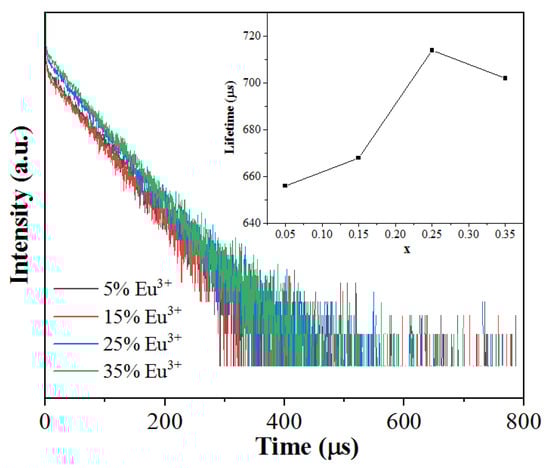 By linear fitting, the lifetimes for the Na5Zn2Gd(MoO4)6 phosphors were obtained as 656, 668, 714, and 702 µs when the Eu3+ doping concentration was 0.05, 0.15, 0.25, and 0.35, respectively (see inset of Figure 9). As we can see, there is little difference among the lifetimes of the Na5Zn2Gd1−x(MoO4)6: xEu3+ phosphors with different Eu3+ doping concentrations, indicating a weak concentration quenching behavior of Eu3+ in the present host.