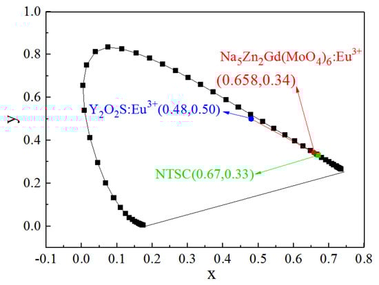 According to the emission spectrum data of Na5Zn2Gd0.75(MoO4)6: 0.25 Eu3+ (the ratio of citric acid to the metal cation is 2:1) under 465 nm excitation, the CIE chromaticity diagram is shown in Figure 10. The color coordinates of the emission spectra of the sample (0.658, 0.341) were located in the red region. When compared with the color coordinates of the commercial Y2O2S: Eu3+ (0.48, 0.50) red phosphor, it is closer to the U.S. National Television Standards Committee (NTSC) standard values (0.670, 0.330), which means the Na5Zn2Gd0.75(MoO4) 6: 0.25 Eu3+ is a stable red phosphor for white LEDs.