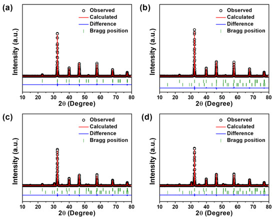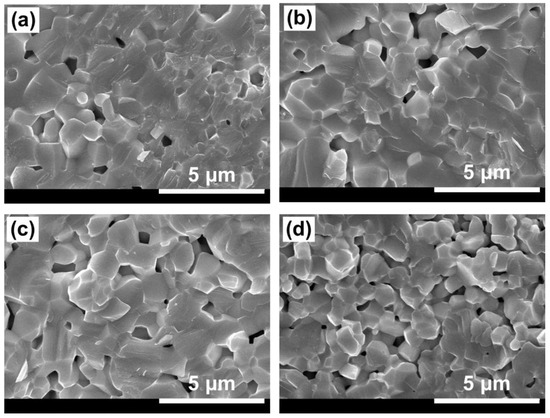The microstructural properties of the sintered samples were examined using a scanning electron microscope (SEM; Hitachi SU8010, Tokyo, Japan). The porosity of the sintered samples was measured using Archimedes’ principle. The crystal structure of the sintered samples was analyzed by X-ray diffraction (XRD) at room temperature using an XRD system (X’Pert PRO, PANalytical, Almelo, the Netherlands) with Cu Kα radiation (λ = 1.5406 Å). The crystal structure was further analyzed using XRD Rietveld refinement with the FullProf software. XPS (K−alpha, Thermo VG, Oxford, UK) was employed to examine the surface elemental composition and valence states of the constituent elements in the sintered samples. The optical band-gap of the sintered samples was estimated from the diffuse reflectance spectra measured using a UV−Vis−NIR spectrophotometer (Agilent, Varian Cary 5000, Santa Clara, CA, USA).