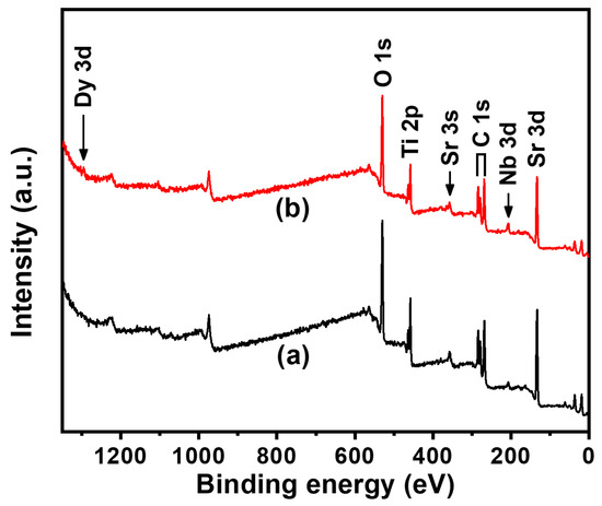 The oxidation states and binding energies of the constituting elements (Sr, Dy, Ti, Nb, and O) in Sr1−xDyxTi1−yNbyO3−δ (0.05 ≤ x, y ≤ 0.10) are investigated using XPS. The survey spectra of Sr1−xDyxTi1−yNbyO3−δ in the binding energy range of 0–1350 eV show the presence of the constituting elements and their binding energies (Figure 3). No notable differences are observed among the survey spectra with varying compositions. The binding energies and oxidation states of the Sr, Dy, Ti, Nb, and O elements are obtained from high-resolution XPS scan spectra. In addition to the characteristic peaks of the constituting elements, the C 1s peaks are observed at ~285 eV, indicating the presence of carbon- and oxygen-containing contaminants that typically adsorb onto the sample surface from the atmosphere [33,34,35]. The adsorbed oxygen may interfere with the O in Sr1−xDyxTi1−yNbyO3−δ.