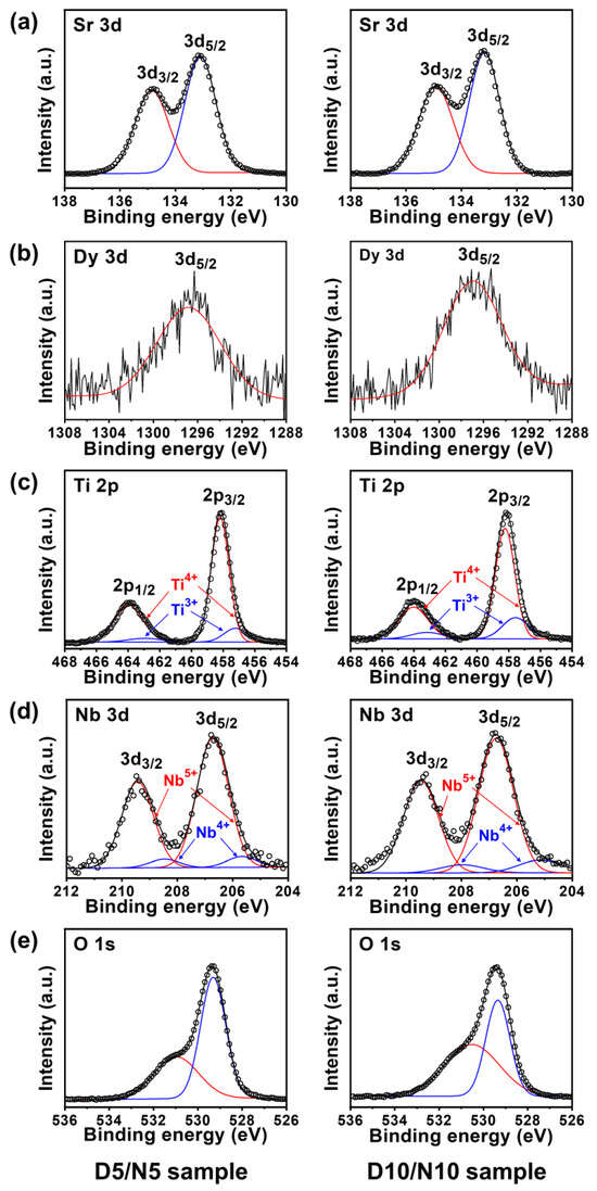 High-resolution XPS spectra of the (a) Sr, (b) Dy, (c) Ti, (d) Nb, and (e) O elements in the D5/N5 and D10/N10 samples.