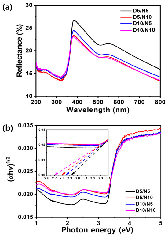 To investigate the optical band-gap energy of Sr1−xDyxTi1−yNbyO3−δ (0.05 ≤ x, y ≤ 0.10), the UV−Vis−NIR diffuse reflectance spectra are obtained, as shown in Figure 5a. The diffuse reflectance substantially increases with increasing wavelength in the wavelength of 350 to 400 nm. It has been reported that SrTiO3 is an indirect semiconductor [50,51]. Therefore, the band-gap energy (Eg) of Sr1−xDyxTi1−yNbyO3−δ can be calculated using the relation (αhν)1/2 = A(hν − Eg) [52], where α is the absorption coefficient, ν is the photon frequency, h is the Planck constant, Eg is the optical band-gap energy, and A is a proportionality constant. The band-gap energy (Eg) of all the samples is obtained by extrapolating the linear part to (αhν)1/2 = 0, as represented in Figure 5b. The band-gap energies slightly decrease with increasing Dy/Nb concentrations, e.g., 2.9 and 2.7 eV for the D5/N5 and D10/N10 samples, respectively (Table 3). Furthermore, the band-gap energies of the prepared Sr1−xDyxTi1−yNbyO3−δ are smaller than those of previously reported pristine SrTiO3 (~3.2 eV) [52,53]. The narrowing of band-gap energy is beneficial for enhancing the electron concentration due to the increased excitation of electrons from the valence to conduction band.