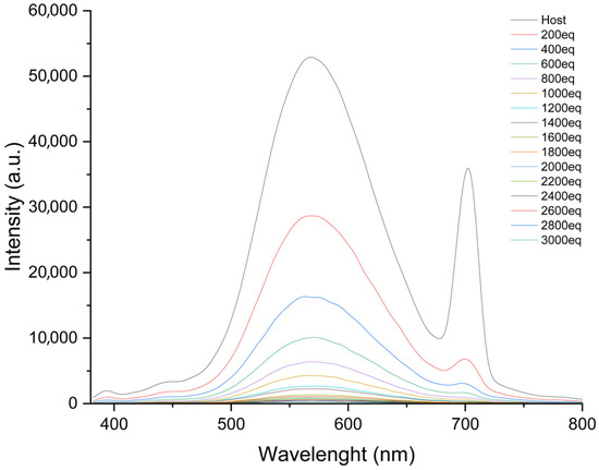 The fluorescence titration between KC1 (1 × 10−5 M) and Fe3+ ions (0–3000 eq) in DMSO:H2O (7:3 v/v) (Host is the KC1).