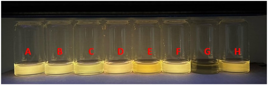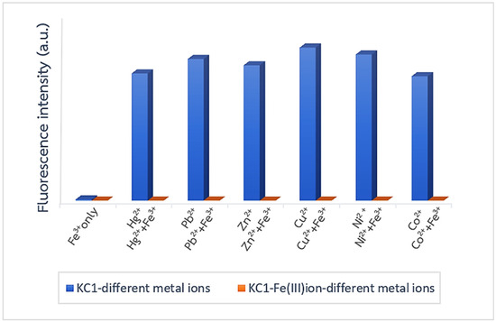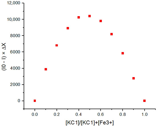 The emission wavelength of KC1 displayed a maximum at 585 nm, and there was another wavelength at 700 nm in DMSO:H2O (7:3 v/v). Upon the addition of the Fe3+ ion to the KC1 solution in the equivalent concentration range of 0–3000, the emission bands of KC1 at 585 and 700 nm are quenched due to the Fe3+ ion complex directly binding to KC1 (Figure 4) [22]. Upon the addition of different metal ions, the fluorescence emission at 585 gradually decreased, as depicted in Figure S2 (see Supplementary Materials). Results from the fluorescence titration indicated that KC1 was selective regarding the Fe3+ ion rather than the other metal ions. In the case of other metal ions, the KC1 showed a weak interaction, with the emission wavelength at 585 nm representing a small change. The maximum intensity ratio between KC1 and Fe3+ ions was shown to be 0.5 by using Job’s method, and a complex between KC1 and Fe3+ ions at a 1:1 ratio formation is shown in Figure 5 [28,29]. Moreover, there was only a color change of KC1 and Fe3+ ions under a UV lamp at 365 nm. For other metal ions, the color stayed the same, as shown in Figure 6. This result suggested that KC1 was obviously selective to the Fe3+ ion. The Stern–Volmer plot of complexation between KC1 and the Fe3+ ion is shown in Figure 7. The Stern–Volmer constant (Ksv) was evaluated as 21,203 M−1. Furthermore, the sensitivity and selectivity of the complexation between KC1 and the Fe3+ ion was investigated by analyzing the competition of various metal ions in the solution, as shown in Figure 8. It was found that KC1 and Fe3+ exhibited quench fluorescence, but KC1 and other metal ions still displayed the fluorescence’s blue bar graph. For KC1-Fe3+ and various metal ions, the orange bar graph indicated that there was no fluorescence emission at 585 nm, meaning there was no effect when adding other metal ions into the KC1-Fe3+ solution. Therefore, KC1 has the ability to detect Fe3+ while mixed with other metal ions in a solution. Furthermore, the limit of detection (LOD) between KC1 and the Fe3+ ion was evaluated as being 0.74 μM [28,29].