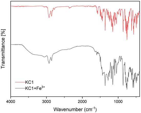 The FTIR spectra of KC1 and mixing KC1 with Fe3+ by using the ATR mode for analysis are shown in Figure 9. For the KC1 solid, the main function groups and wavenumber in units of cm−1 are represented by a red line and are also listed in Table 3.
