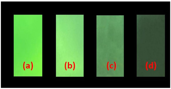 The TLC plates of (a) coated-KC1 (1 × 10−3 M) with Fe3+ ions in (b) 1 equiv., (c) 5 equiv. and (d) 10 equiv. under a UV lamp at 365 nm in DMSO.