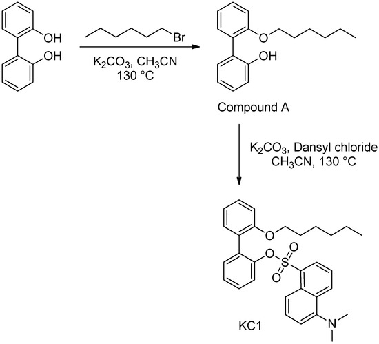 2.5. Synthesis of 2′-(Hexyloxy)-[1,1′-Biphenyl]-2-yl 5-(Dimethylamino)Naphthalene-1-Sulfonate, KC1 Exhibited in Scheme 1
