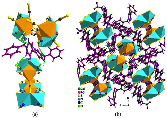 (a) Hydrogen bonds between BV2+ cations and [Ag2Cd(SCN)6]n2n− chains; and (b) packing diagram of {(BV)[Ag2Cd(SCN)6]}n (Polyhedron color: CdN6: orang; Aqua: AgS4).