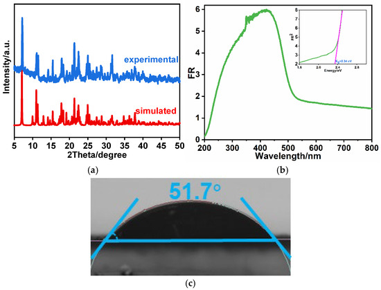 The phase purity of {(BV)[Ag2Cd(SCN)6]}n could be validated by the good consistence between the experimental patterns with the simulated ones (Figure 3a). The photophysical property was determined by the UV–Vis spectrum (Figure 3b). Two adsorption peaks appear at 284 and 424 nm. The first peak is ascribed to the internal transitions (π–π*) of viologen dication [21,40]. According to the structural analysis, short S···N distance hints the strong charge transfer (CT) interactions between electron-rich silver/cadmium thiocyanate and viologen. Thus, the latter peak stems from the CT transition from the electron-rich [Ag2Cd(SCN)6]n2n− donors and the BV2+ acceptors [41]. The optical gap calculated using the K-M equation is 2.34 eV (Figure 3b), which is similar with other silver thiocyanate/viologen hybrids such as {(EV)[Ag4(SCN)6]}n (2.42 eV) [21]. The good hydrophily of this photocatalyst (51.7°, Figure 3c) water contact angle of implies, which will be beneficial for its application in seawater pollutant degradation.