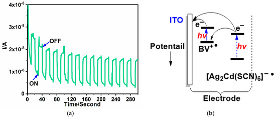 Photo-generated current has commonly been observed in viologen/metal halide hybrids [28,32], but the photo-generated current performances of metal pseudohalides are rare [21]. The photocurrent response of the {(BV)[Ag2Cd(SCN)6]}n-coated film is shown in Figure 4a. To our interest, under the repetitive irradiation, this hybrid exhibits repeatable photocurrents, which stabilize at about 1.75 × 10−8 A, which is about 1/10 of {(EV)[Ag4(SCN)6]}n [21]. The introduction of second cadmium could lower the photocurrent intensity. Previous work has proved that the organic viologen-coated film showed no photocurrent response [42], so [Ag2Cd(SCN)6]2− donor/BV2+ acceptor systems are the reason for photocurrent generation. The mechanism about the photo-generated current of this work can be proposed as follows: upon irradiation, BV+• radicals can generate the photosensitive BV2+ to give BV+•, whilst in the meantime, [Ag2Cd(SCN)6]2− can transfer its electrons to BV2+ via CT interactions. Then, BV+• radicals transfer their electrons to the ITO electrodes with the reproduction of BV2+. The [Ag2Cd(SCN)6]n2n− anions lose one electron to produce [Ag2Cd(SCN)6]−• radicals to give the electron conductive pair of [Ag2Cd(SCN)6]−•–BV+• (Figure 4b).