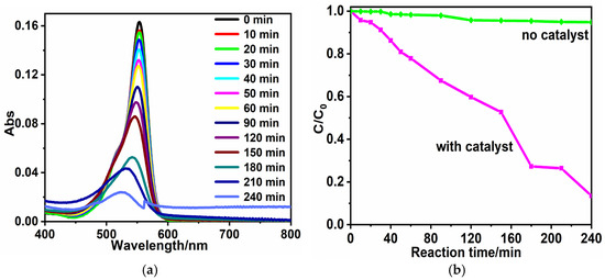 Photocatalytic degeneration on rhodamine B (RhB) was conducted in artificial seawater, which was prepared according to the literature (3.4 wt% containing NaCl (77.9%), MgCl2 (9.6%), MgSO4 (6.1%), CaSO4 (4.0%), and KCl (0.07%) [37]. Firstly, 50 mg catalyst powder was dispersed in 80 mL RhB seawater solution (10 ppm), then adsorption/desorption balance of dyes on the catalyst surfaces was achieved by stirring the suspension in the darkness for 2 h. Afterwards, the visible light from the 300 W Xe arc lamp was kept irradiating for 220 min, during which a 3 mL reacting solution was taken at intervals of fixed time. Centrifugal separation was conducted to obtain the transparent solution, and UV−Vis measurements (PerkinElmer Co., Waltham, MA, USA) were executed to determinate the residual concentration of RhB. Finally, the degradation percentage was calculated from the C/C0 value, in which C has absorption intensity of 553 nm of RhB of each sample and C0 is the initial intensity.