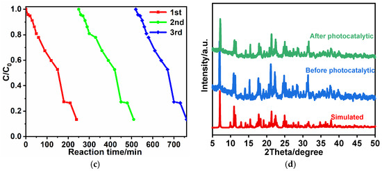 (a) Time-dependent UV−Vis spectra of RhB with the presence of catalyst; (b) Degradation ratio of RhB different irradiation times with or without the presence of catalyst; (c) Recycling tests of the catalyst for RhB photodegradation under light irradiation; and (d) PXRD patterns before and after photocatalytic reaction.