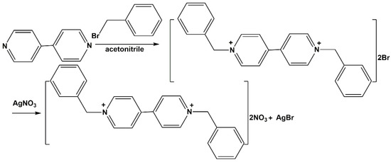Synthesis of BV·(NO3)2: BV·(NO3)2 was prepared according to the literature method (Scheme 1) [34]. 4,4′-bipyridine (3.12 g, 0.02 mol) was dissolved in 50 mL acetonitrile and benzyl bromide (10.26 g, 0.06 mol) was added slowly dropwise and refluxed at 70 °C for 12 h. A large amount of orange-red powders precipitated in the round bottom flask, which was filtered after cooling to room temperature and dried under vacuum to obtain 5.41 g of BV·Br2 (yield about 54%). Afterwards, 4.98 g (0.01 mol) BV·Br2 was completely dissolved in 50 mL distilled water to obtain a yellow solution. In another beaker, 3.40 g (0.02 mol) AgNO3 was dissolved in 20 mL distilled water. The above two solutions were mixed and stirred well to produce a large amount of yellow AgBr precipitates, which were filtered to obtain a colorless and transparent liquid. The filtrate was filtered, evaporated, and dried to obtain a pale yellow product of BV·(NO3)2 (yield: 2.33 g, 49%).