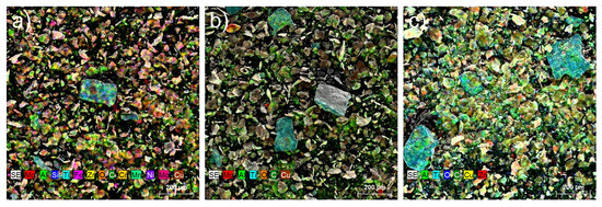 (a–c) SEM-EDX mapping TC1–TC3 area (from left to right).