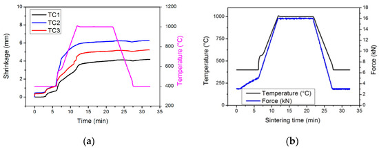 (a,b) Sintering curves, shrinkage over time, and applied pressure force.