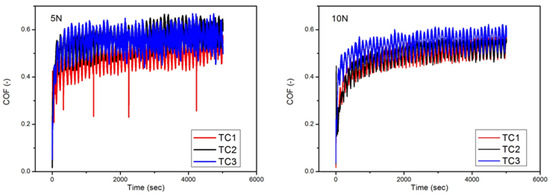 Coefficient of friction vs. time for different values of load (5 N, 10 N).