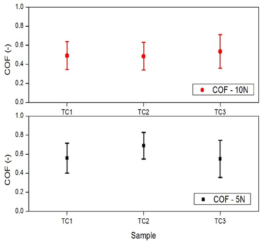 Average coefficient of friction for applied load 5N and 10N with deviation values.