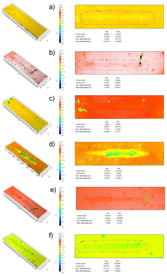 Visualisation of the confocal images of wear tracks (a–c) load 5 N, (d–f) load 10 N.