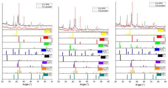 Each sample was measured before and after sintering in order to evaluate the change of phase composition after SPS. Measured data were evaluated by program High Score (Malvern Panalytical, Almelo, The Netherlands) using a PDF-2 database for identification of phases. Figure 9 shows the results of the XRD analysis of the TC1–TC3 series of samples, comparing high-energy ball-milled powders and sintered discs. Results of XRD analysis suggest that during the SPS process, Ti and Cu form intermetallic phases identified as CuTi and Cu3Ti. This can be determined in the TC1–TC3 samples series by the presence of peaks of lower intensity of Cu and Ti visible characteristic peaks; however, peaks matching intermetallic phases appear to be present after the SPS process which was also observed by [45,46]. In the TC1–TC3 series of samples, the presence of TiC was indicated after spark plasma sintering which was most likely formed after by reaction with graphene [47] supported by a relative decrease in graphene in sintered samples. The system contained a high amount of carbon originating from SPS graphite mold and dies. Thus, carbides are forming, which is confirmed by the results from XRD and EDX analyses. In summary predominantly in the TC1–TC3 series of samples major phase change after SPS occurred by mixing/reacting of Cu and Ti resulting in identified CuTi and Cu3Ti phases; however, there is a possibility that there is the presence of multiple stoichiometries CuxTiy depended on the local concentration of elements.