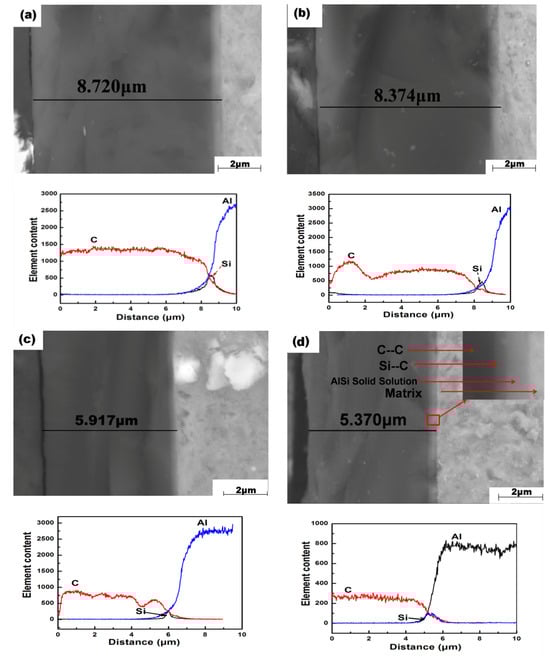 From the figure, it can be seen that there is a clear transition layer between the film and the substrate and that the film transition layer substrate bond is good. According to the EDS analysis, the main element of the outermost DLC film is C, while the main elements of the transition layer are C, Si, and Al. The main element of the innermost substrate is Al. From the XRD results in Figure 3, it can be seen that the Al9Si phase appears at 38°, 44°, and 82°, with preferred orientations of (111), (200), and (222), respectively. At the same time, the Si5C3 phase appears at 44°, with a preferred orientation of (210). From the partially enlarged image in Figure 2d, it can be seen that a layer of aluminum–silicon solid solution is first deposited on the surface of 2024 aluminum alloy, followed by a layer of C-Si layer on top of the aluminum–silicon solid solution, and finally, a layer of C-C layer is deposited. The thickness of the DLC film decreases from 8.720 μm to 5.370 μm with the increase in deposition temperature.