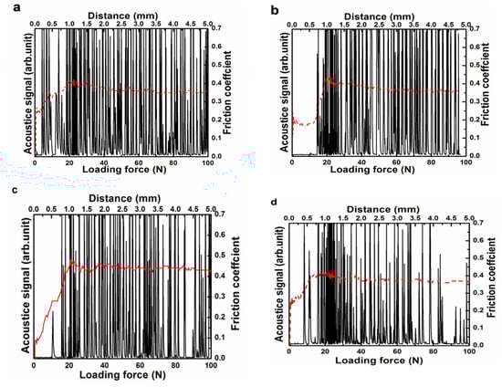 Acoustic emission signal for the progressive load on the DLC film at the different deposition temperatures. (a) 50 °C, (b) 100 °C, (c) 125 °C, and (d) 150 °C. (The red line in the figure represents the loading force).