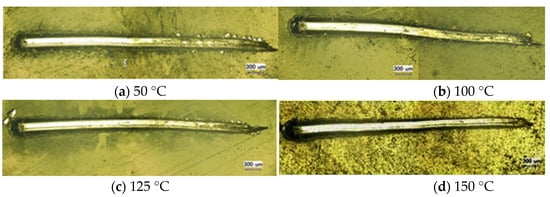 Figure 6 shows the super-depth map of DLC film scratches at different deposition temperatures. When the deposition temperature is 50 °C, there is a significant cracking phenomenon around the scratches. However, when the deposition temperature rises to 100 °C, the cracking phenomenon of the film significantly decreases, and the cracked area does not leak out of the substrate. When the sedimentation temperature is 125 °C, there is a small amount of detachment around the scratch. When the sedimentation temperature is 150 °C, there is also a slight detachment phenomenon around the scratch.