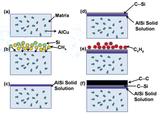 Figure 7 is a schematic diagram of the DLC film deposition process. Figure 7a is a schematic diagram of the aluminum alloy matrix, with the AlCu phase dispersed in the matrix. When a certain amount of tetramethylsilane is introduced into the cavity, it decomposes under the action of pulse voltage, and the decomposed silicon particles and hydrocarbon particles move towards the surface of the 2024 aluminum alloy (Figure 7b). In the periodic table of chemical elements, silicon is adjacent to aluminum and they have electronegativities of 1.90 and 1.61, respectively []. Due to the close electronegativity of silicon and aluminum elements, Si particles and Al particles are prone to forming solid solutions. When silicon particles move to the surface of the 2024 aluminum alloy, they first form a solid solution with the aluminum particles, thereby improving the bonding strength between the substrate and the film (Figure 7c). As shown in Figure 3, Al9Si and Si5C3 formed on the surface of the 2024 aluminum alloy, indicating that, with the prolongation of time, Si became supersaturated in Al and could not form a solid solution, forming a C-Si transition layer. The atomic numbers of carbon atoms and silicon atoms are 6 and 14, respectively, and their outermost electron numbers are both four. In order to achieve a stable structure with the outermost eight electrons, during the deposition process, carbon particles and silicon particles form covalent bonds while undergoing orbital hybridization [,]. Under the action of a pulsed power supply, carbon particles form unpaired electrons with all four electrons on the 2s and 2p orbitals, forming four covalent bonds with the outermost four electrons of silicon particles. Under hybridization, the number of bonds formed increases, and the electron cloud becomes denser in the direction of the tetrahedral vertices, making the bonding ability stronger and the deposited film more stable (Figure 7d). After depositing a certain thickness of the transition layer, tetramethylsilane is turned off and a certain proportion of argon and acetylene gas is introduced into the chamber. Argon gas is used to increase the ionization rate of acetylene gas, causing it to decompose into hydrocarbon particles. The ionized carbon particles also move towards the surface of the transition layer (Figure 7e). A C-C layer is formed on top of the C-Si layer, and due to the same carbon silicon structure, the method of forming the C-C layer is basically the same as that of forming C-Si. After deposition, a stable DLC film (Figure 7f) was obtained on the surface of the 2024 aluminum alloy.