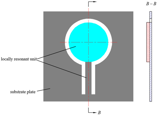 Considering the need for dependability in the performance of acoustic metamaterials in automotive applications, as well as the ease of manufacturing, we propose constructing a locally resonant acoustic metamaterial plate using pure metal sheets as the substrate. The fundamental unit cell structure is illustrated in Figure 1. The fundamental unit cell structure is divided into two functional components: the substrate plate and the locally resonant unit. The substrate plate is responsible for transmitting bending wave vibration energy and providing support for the locally resonant units. In turn, the locally resonant units concentrate the vibration energy within a specific frequency range, effectively blocking its transmission. Based on material types, the fundamental unit cell consists of a substrate material and supplementary mass materials. The substrate material is selected from lightweight metals such as aluminum, aluminum alloys, and titanium alloys to effectively control the overall mass of the acoustic metamaterial plate. The supplementary mass materials, on the other hand, include denser metals or alloys, such as steel, which serve to increase the mass characteristics of the locally resonant units within a compact spatial configuration.