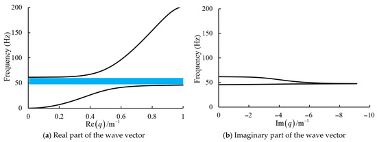 The band characteristics of the locally resonant acoustic metamaterial plate can be calculated using Equation (18). We set the design parameters, as listed in Table 1, and the resulting band characteristics are depicted in Figure 6. The figure clearly demonstrates that the locally resonant acoustic metamaterial plate exhibits a low-frequency bandgap in the range of 46 to 60 Hz, effectively suppressing low-frequency bending waves within this frequency range.