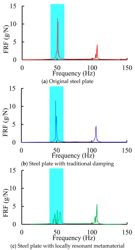 The test results of the frequency response function for the steel plate are presented in Figure 10. It can be observed that the original steel plate displays a peak in its frequency response function at approximately 50 Hz. Following the installation of a traditional damping plate, no significant change is observed in the frequency response function of the steel plate. However, upon the installation of the locally resonant acoustic metamaterial plate (featuring a bandgap of 46–60 Hz), the peak in the frequency response function at approximately 50 Hz is significantly diminished, with the amplitude decreasing by nearly 66%. The traditional damping plate provides limited attenuation of low-frequency vibrations within the plate. In contrast, the appropriately designed locally resonant acoustic metamaterial plate can effectively impede the transmission of low-frequency bending waves across the flat plate through its bandgap mechanism. This illustrates that the bandgap of the acoustic metamaterial plate, designed through theoretical calculations, is indeed effective.