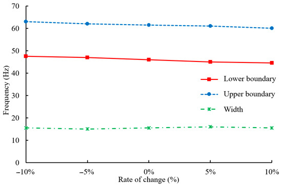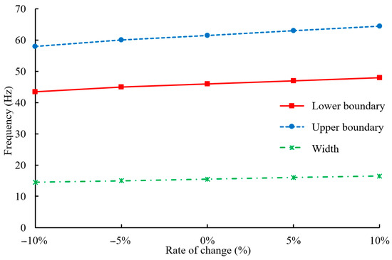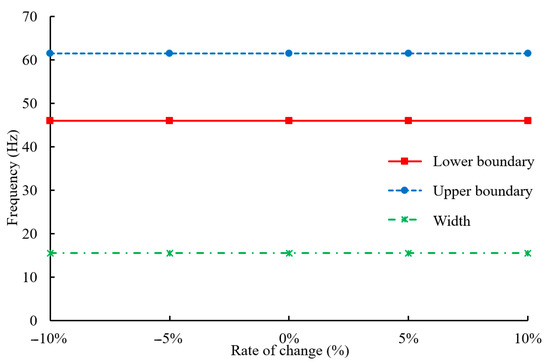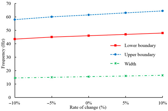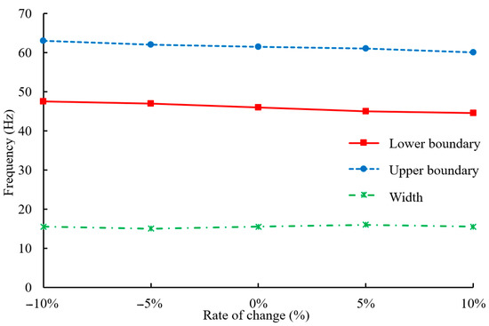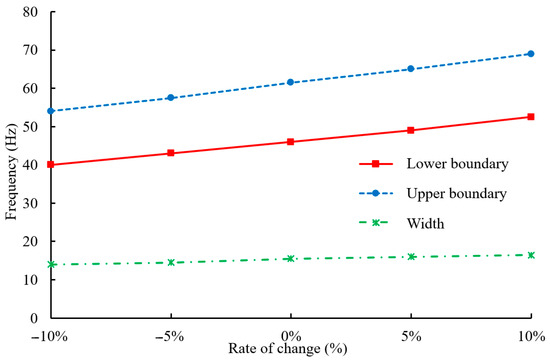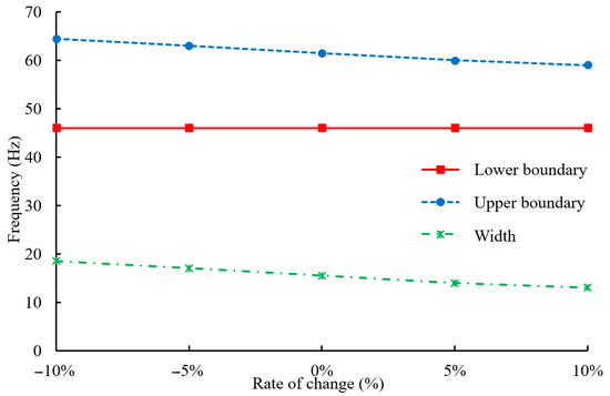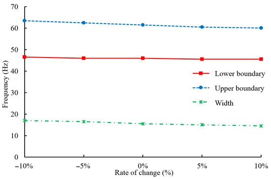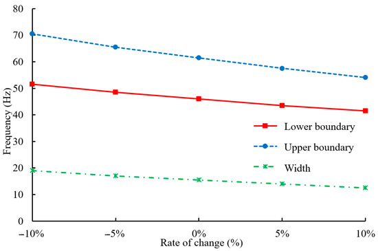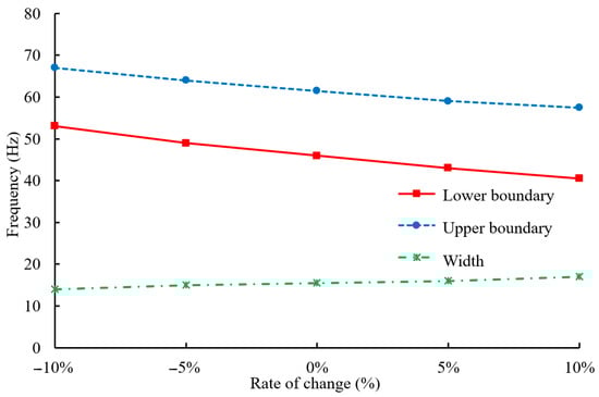 Variations in the upper boundary, lower boundary, and width of the bandgap with changes of the substrate material elastic modulus .
