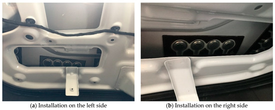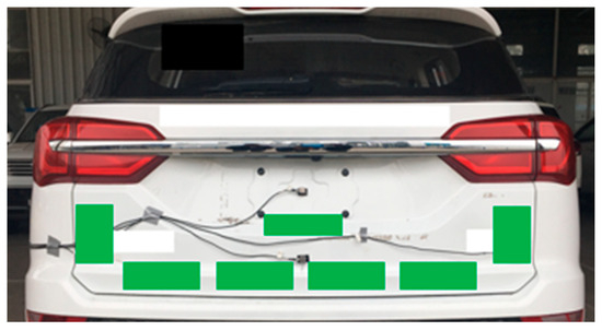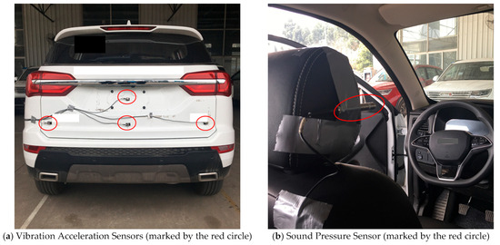 Under the acceleration and constant-speed conditions of the traditional power SUV, we assessed the vibration response of the tailgate and the noise levels at the driver’s right ear within the vehicle. The sensor installation method is depicted in Figure 24, whereas the analysis results for the acceleration condition tests are presented in Figure 25, Figure 26, Figure 27 and Figure 28.
