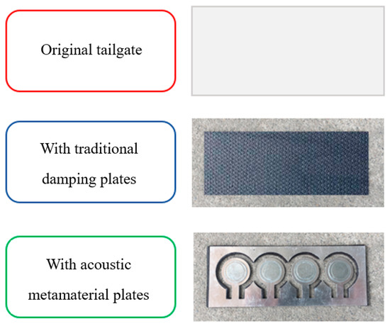 To verify the effectiveness of the locally resonant acoustic metamaterial plates in suppressing low-frequency noise inside the vehicle, we conducted tests on the vehicle’s NVH (Noise, Vibration, and Harshness) performance under three conditions: the original vehicle state, the state with traditional damping plates installed on the tailgate, and the state with acoustic metamaterial plates installed on the tailgate (as shown in Figure 23). The placement and quantity of the traditional damping plates were identical to those of the locally resonant acoustic metamaterial plates. The total mass of the acoustic metamaterial plates was 217 g, while the total mass of the traditional damping plates was approximately 510 g.