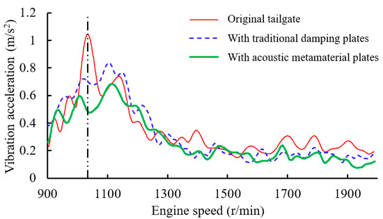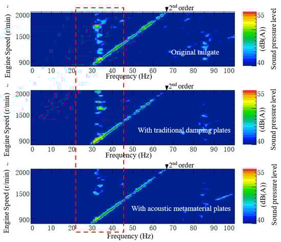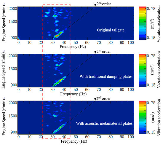 Figure 25 presents a colormap of the tailgate vibration response during acceleration. The horizontal axis represents frequency, the vertical axis indicates engine speed, and the color scale corresponds to vibration acceleration. The data indicate that in the original state, during vehicle acceleration, the vibration amplitude is significantly elevated in the 20–40 Hz range, particularly around 34 Hz, with the vibration energy primarily concentrated at the second harmonic of the engine speed. Following the installation of the traditional damping plate, the low-frequency vibration response exhibits a slight reduction. However, after the application of the locally resonant acoustic metamaterial plate, there is a substantial decrease in low-frequency vibration amplitude in the 20–40 Hz range. This is further illustrated in Figure 26, which shows that the second harmonic component of the tailgate vibration during acceleration experiences a substantial reduction in peak vibration around 1000 r/min engine speed after the installation of the acoustic metamaterial plate.