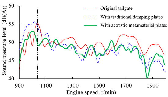 Figure 27 illustrates a colormap of the interior noise at the driver’s inner ear during acceleration. The horizontal axis represents frequency, the vertical axis indicates engine speed, and the color scale corresponds to sound pressure level. The data indicate that in the original state, during vehicle acceleration, the noise amplitude is significantly elevated around 34 Hz, creating a distinct resonance band in that frequency range. After the installation of the traditional damping plate, the low-frequency noise range around 34 Hz increases, particularly at the second harmonic of the engine speed. However, following the application of the locally resonant acoustic metamaterial plate, the noise amplitude around 34 Hz significantly decreases, and the resonance band nearly disappears. This is further evidenced in Figure 28, which demonstrates that after the installation of the acoustic metamaterial plate, the noise peak at approximately 1000 r/min engine speed is reduced by more than 5 dB(A). Overall, the low-frequency noise issue in the vehicle is significantly improved during acceleration.