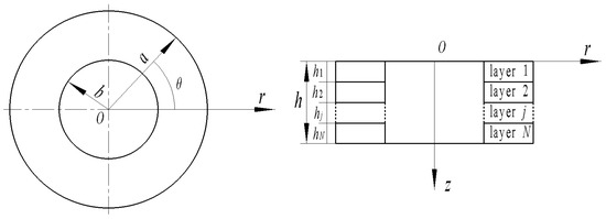 A cylindrical coordinate system (r, θ, z) is considered for the N-ply annular 1D hexagonal piezoelectric QC actuator/sensor with the outer radius a, inner radius b, total thickness h, and j-th layer thickness hj, as illustrated in Figure 1. The center of the top surface of the annular QC actuator/sensor is defined as the origin of the coordinate (r, z) with the positive direction of the z-axis from the top surface to the bottom surface. The symmetric axis of the annular actuator is coincided with the z-axis, and the quasiperiodic and polarization directions of the 1D hexagonal piezoelectric QCs are assumed to be along with the z-axis.
