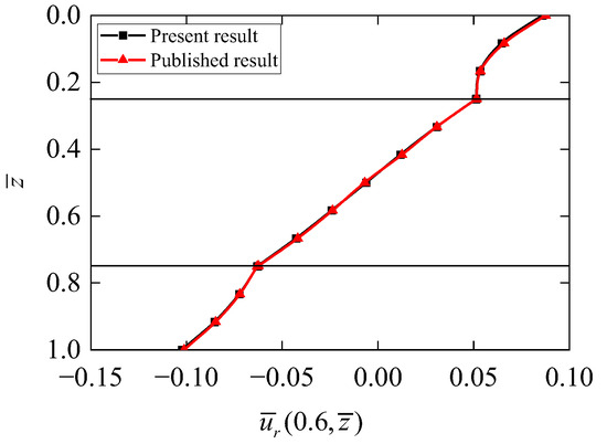 For purposes of comparison, we degenerate the obtained model to an axisymmetric transversely isotropic annular plate model undergoing a top surface normal mechanical load as shown in Equation (39), where ki = 6.2461 is the first root of Equation (35). The first and third layers of the annular plate are made of transversely isotropic material I, and the middle layer is composed of transversely isotropic material II. The thickness of the middle layer is the summation of the thickness of the first and third layers. The elastic constants of material I are given by c11 = 139.0 GPa, c12 = 77.8 GPa, c13 = 74.3 GPa, c33 = 115.0 GPa, and c44 = 25.6 GPa, and those of material II are c11 = 1582.5 GPa, c12 = 315.1 GPa, c13 = 474.4 GPa, c33 = 616.0 GPa, and c44 = 400.0 GPa [28]. The ratio of the inner radius and outer radius is m = 0.5.