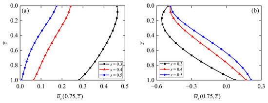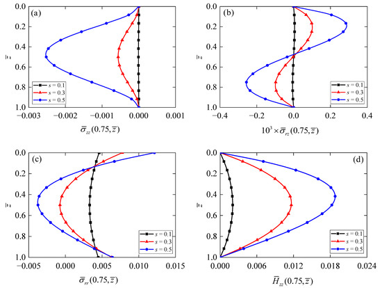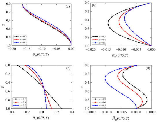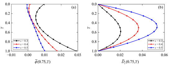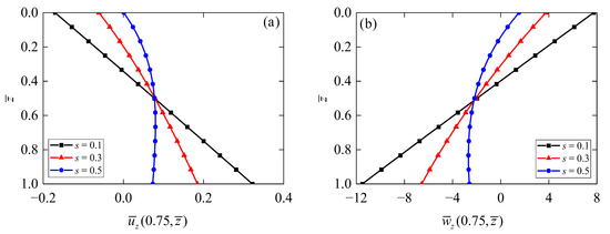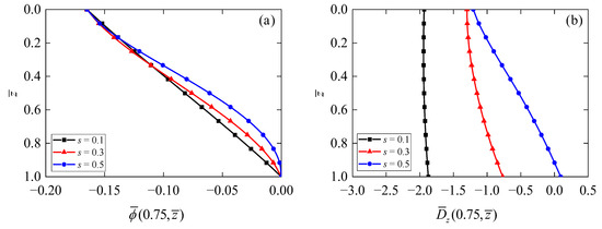 Figure 5 shows the dependences of electric potential and electric displacement on the thickness-to-span ratio of the annular QC actuator/sensor. It is observed that for all thickness-to-span ratios, the maximum value of electric potential (Figure 5a) occurs when s = 0.3, and its value decreases and then increases with the increment of the z-coordinate. In addition, the values of increase with decreasing the thickness-to-span ratio s. On the contrary, it can be observed from Figure 5b that electric displacement increases with an increase in thickness-to-span ratio s.