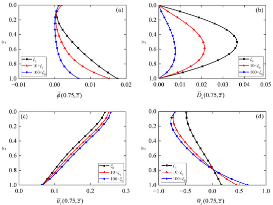 Figure 9 reveals the influences of dielectric coefficients on electric, phonon, and phason fields. It can be found from Figure 9a–b that the electric potential and electric displacement are very sensitive to the dielectric coefficients. decreases with increasing the dielectric coefficients, and a similar trend is observed for . The dependence of phonon displacement (Figure 9c) and phason displacement (Figure 9d) on dielectric coefficients is also significant, and the increment of dielectric coefficients leads to an increase in and . It can be observed from Figure 9e–f that the sensitivity of phonon and phason stresses to dielectric coefficients is found to be not always identical. Namely, a slight variation in phonon stress is induced by the variation in dielectric coefficients, while an obvious variation in phason stress is observed.
