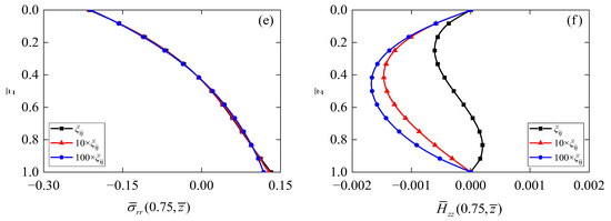 Figure 8 reveals the dependences of phonon and phason stresses on the thickness-to-span ratio s of an annular QC actuator/sensor. The values of phonon stress (Figure 8a), phonon stress (Figure 8b), and phason stress (Figure 8d) at the top and bottom surfaces are zero, indicating that their behaviors are consistent with the boundary conditions of the annular QC actuator/sensor. It is further found that the curves for are symmetric about , while the curves for are antisymmetric about . Phonon stress (Figure 8c), , and increase with increasing thickness-to-span ratio s; also follows the similar rule.